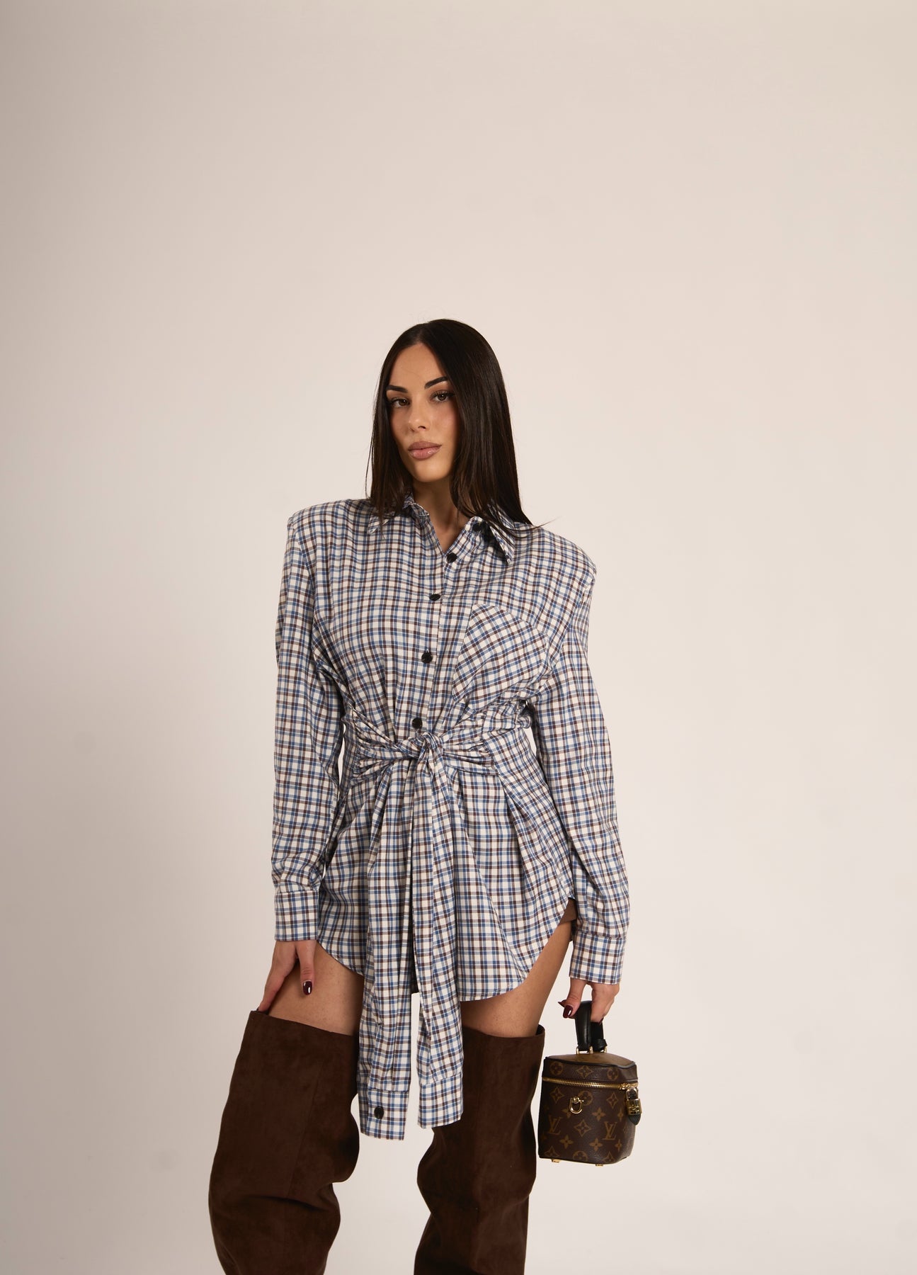 Camicia in check con chiusura a nodo in vita che si può legare sia davanti che dietro e spalline imbottite (100% cotone)