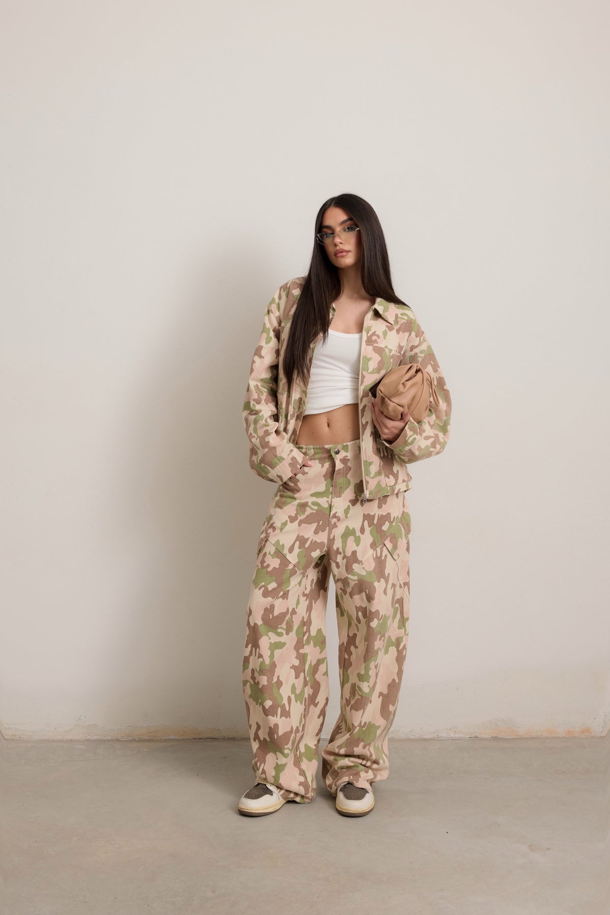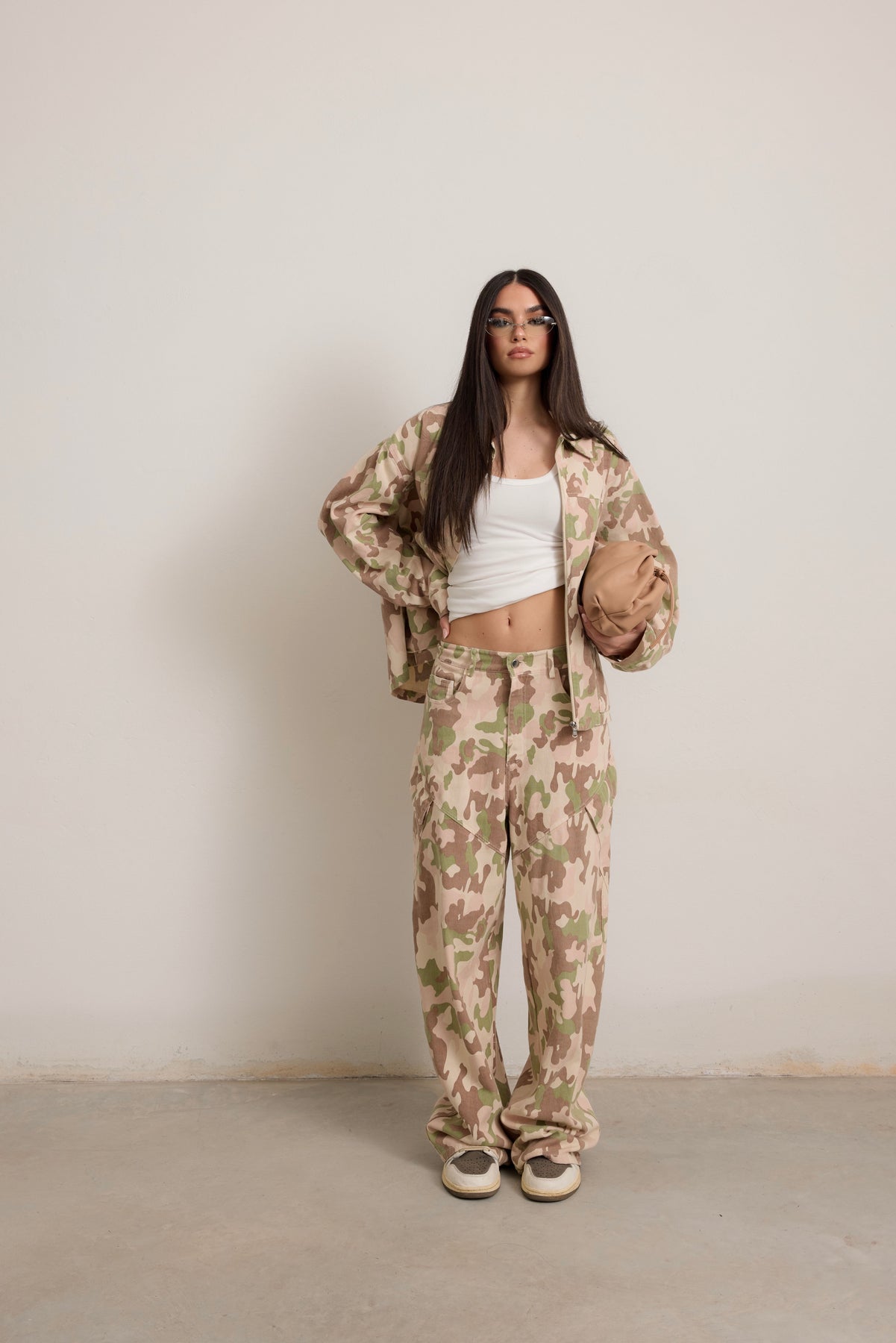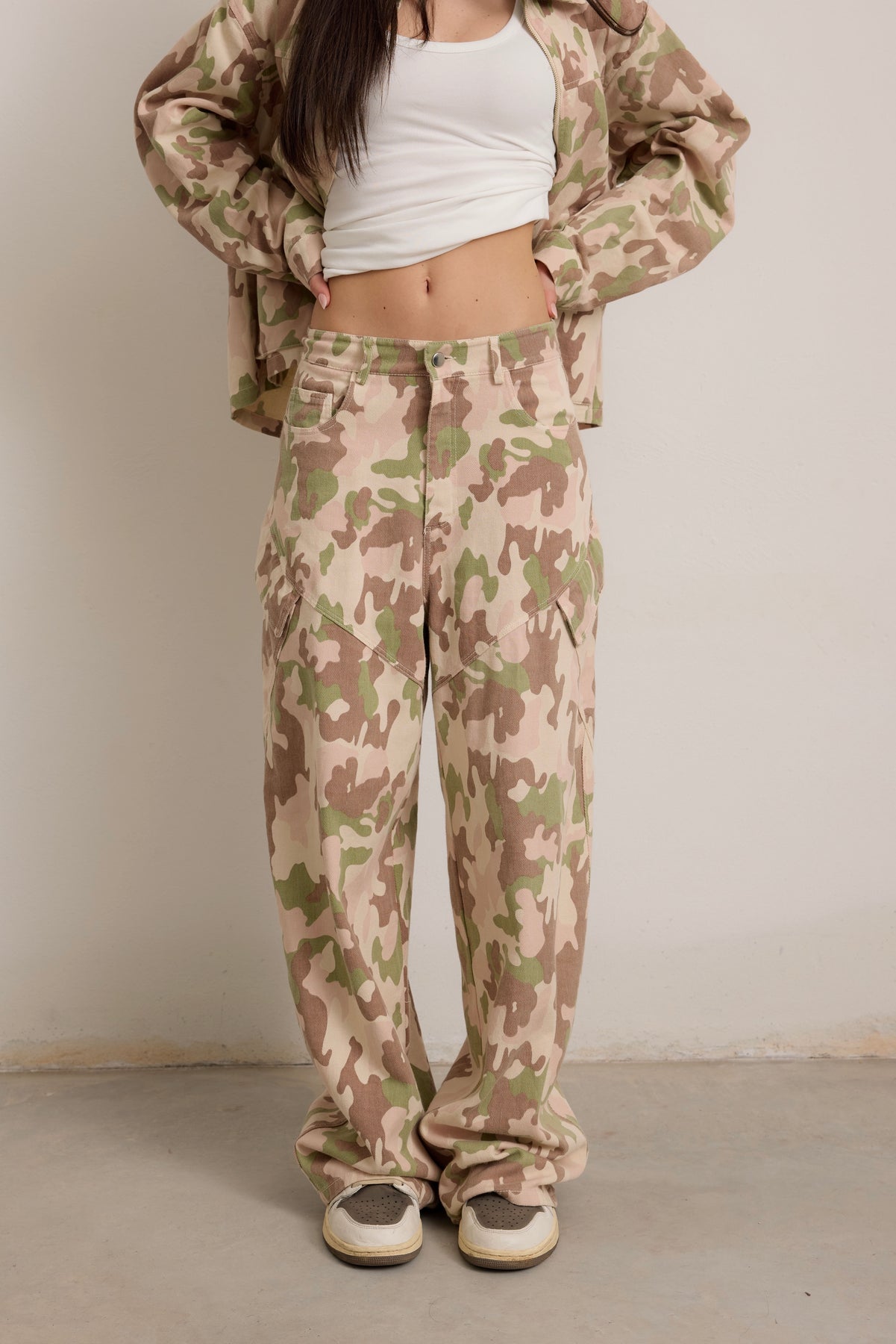• Pantalone cargo over che può essere portato sia a vita normale che bassa scegliendo una taglia in più