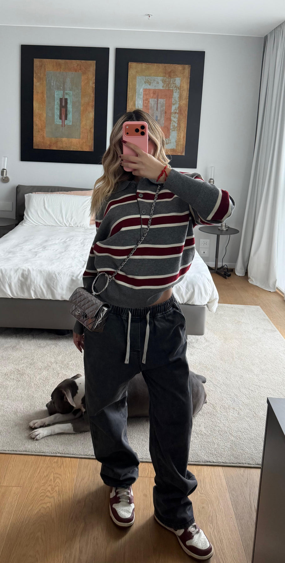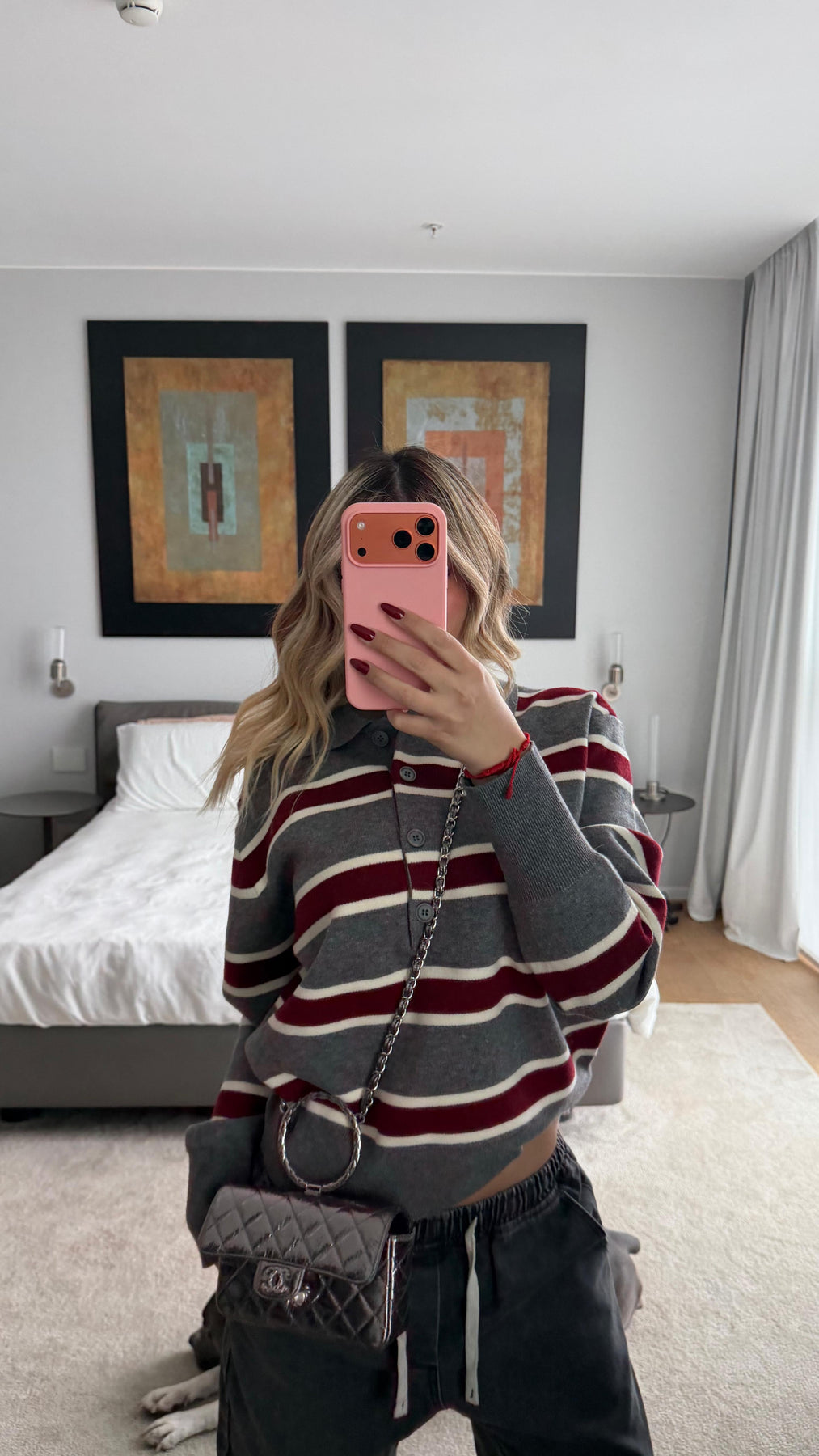 Maglione morbido a righe stile polo (45% viscosa, 35% poliammide, 20% poliestere)