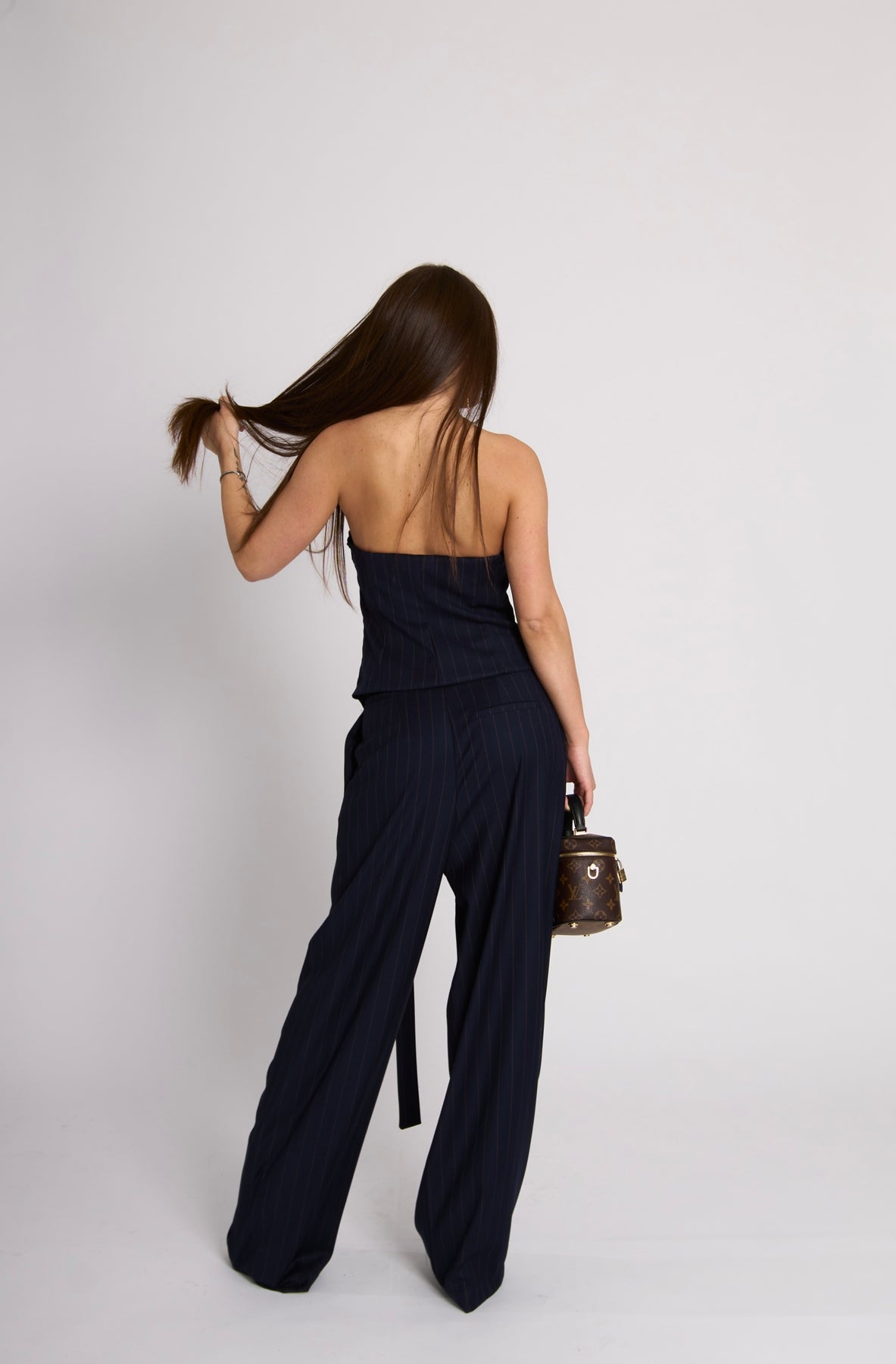 Coordinato gessato composto da pantalone morbido con chiusura a portafoglio e top a fascia asimmetrico con chiusura laterale con cerniera a scomparsa (64% poliestere, 33% viscosa, 3% elastan)