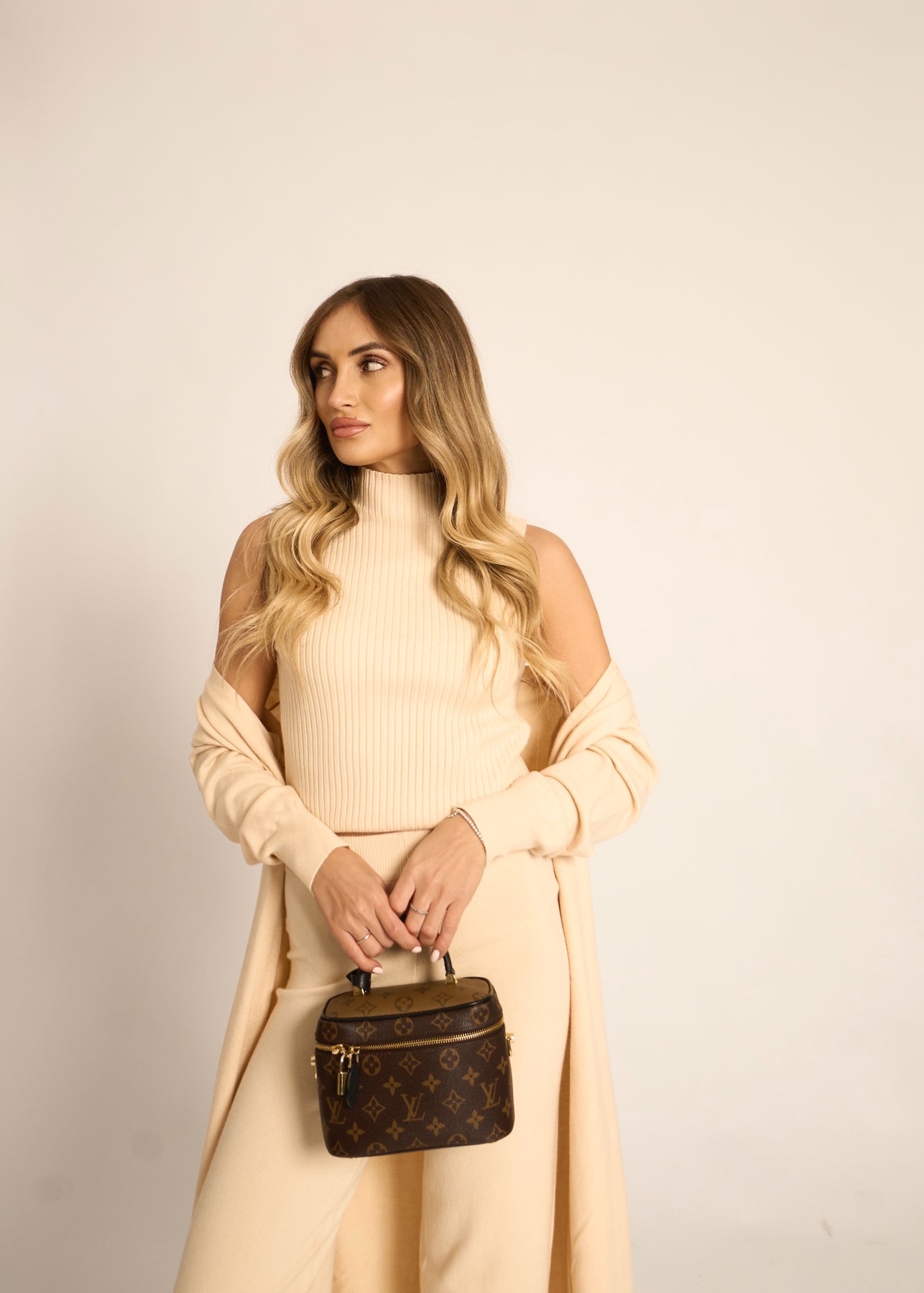 Coordinato in maglia composto da tre pezzi: cardigan lungo, dolcevita smanicato a costine e pantalone palazzo morbido (68% viscosa, 32% poliestere)