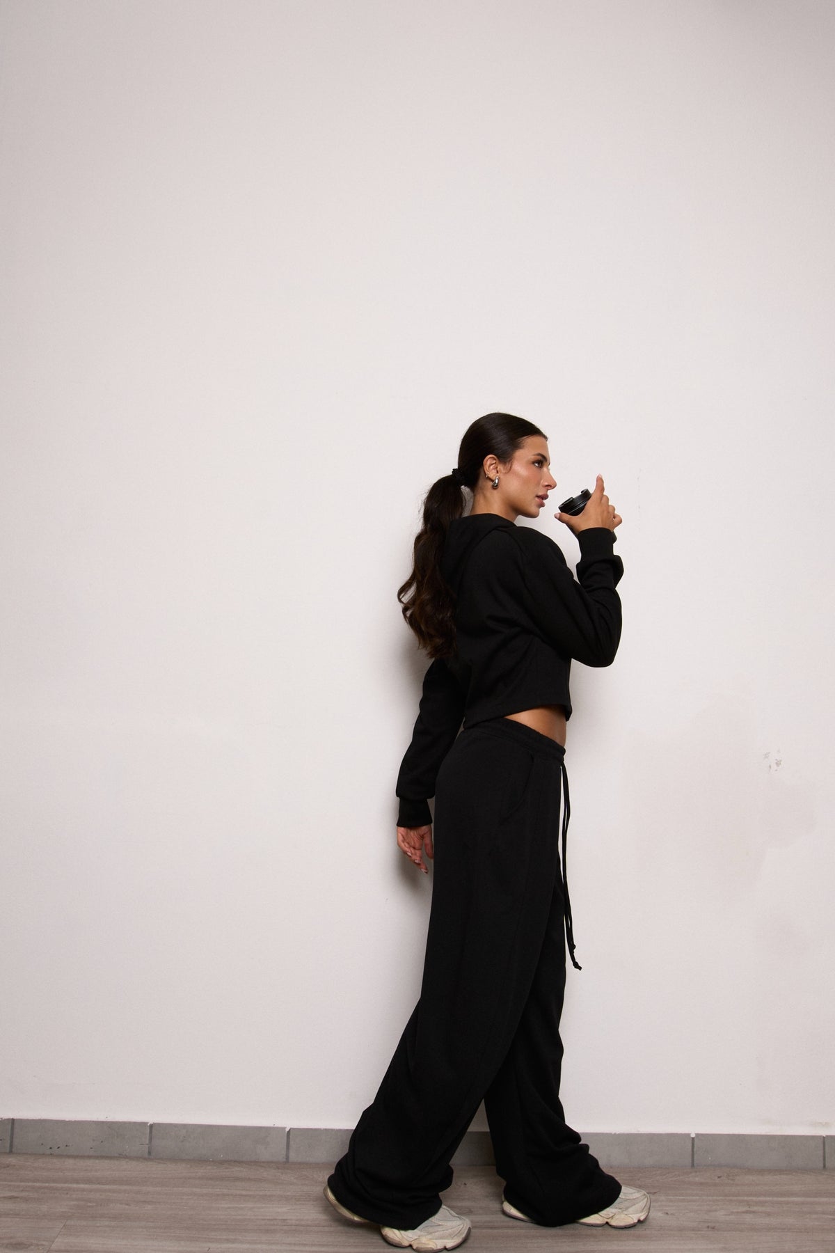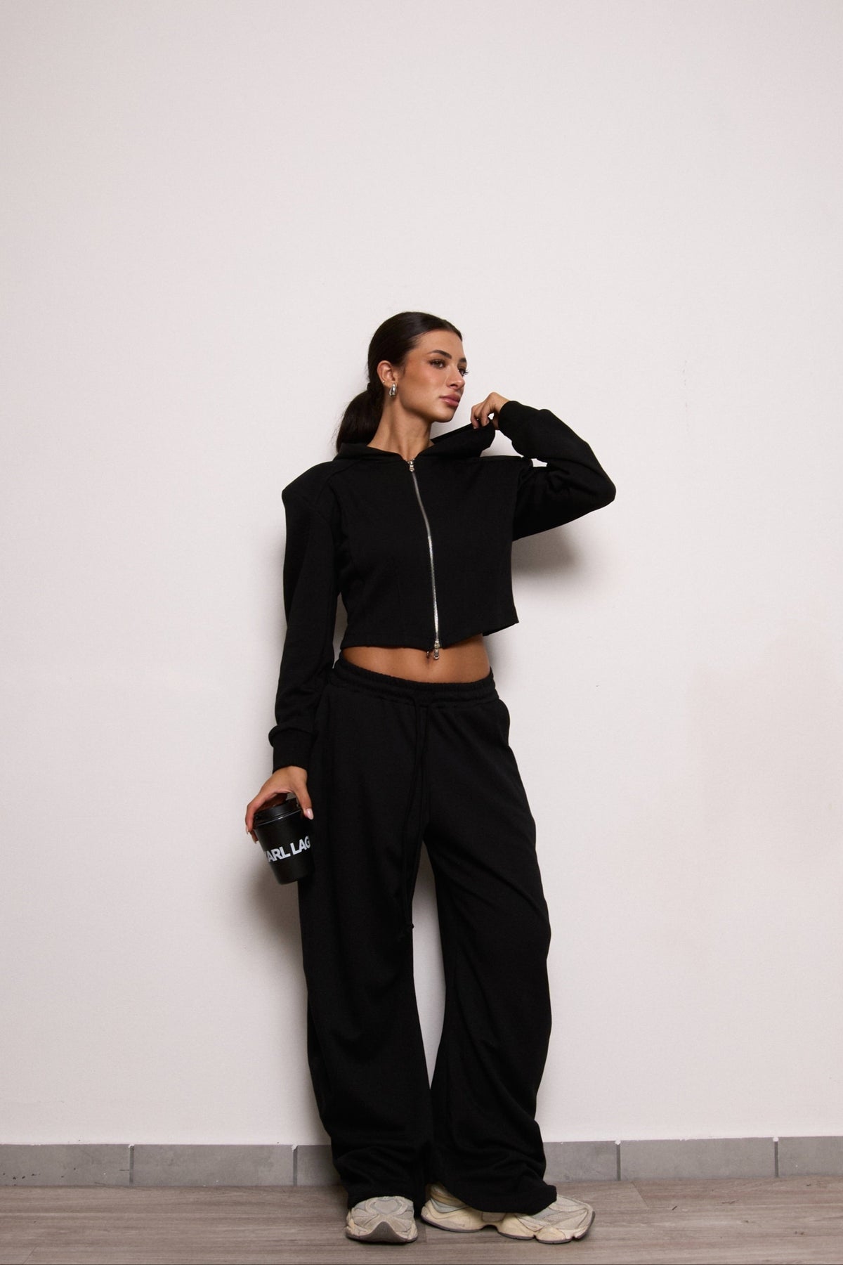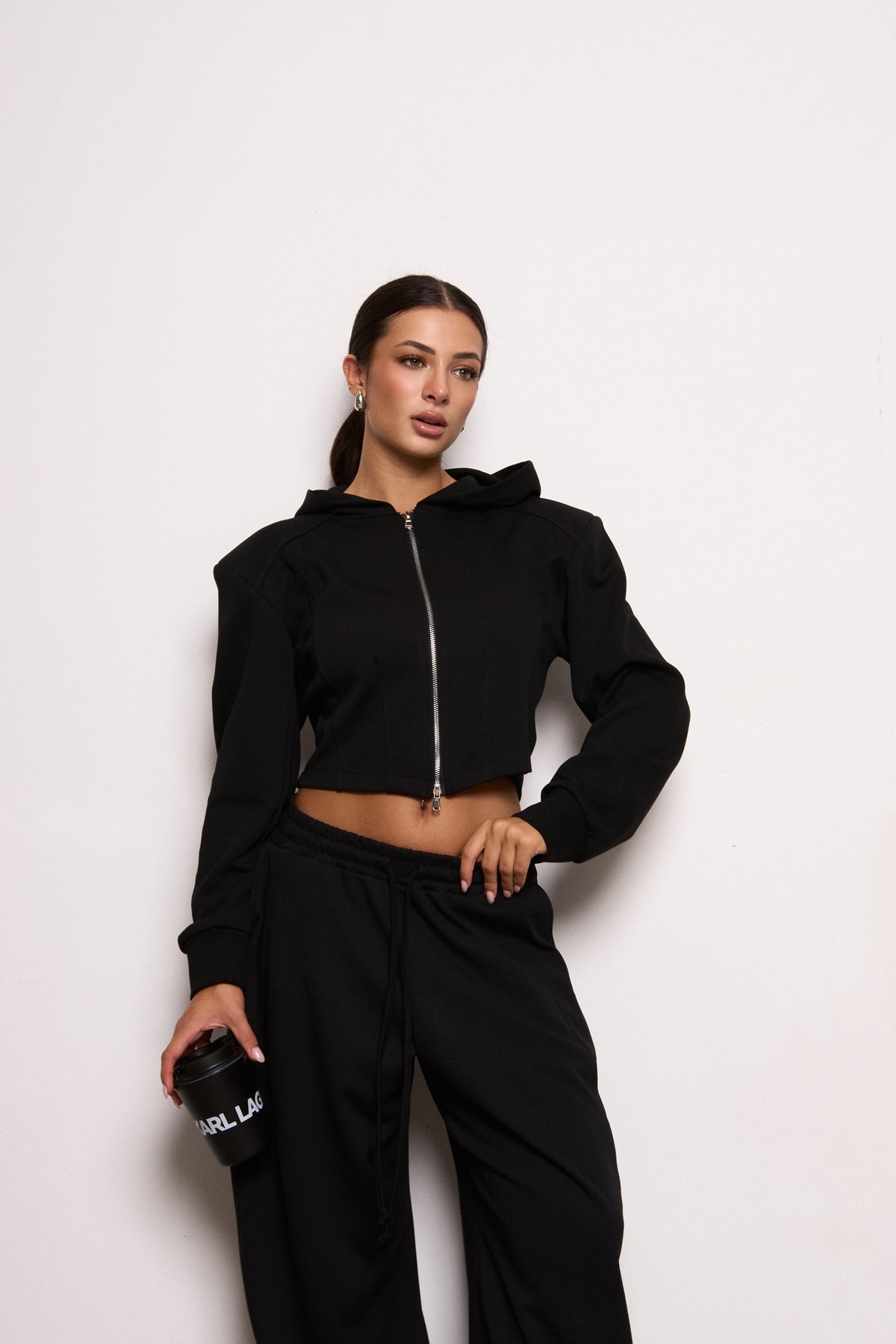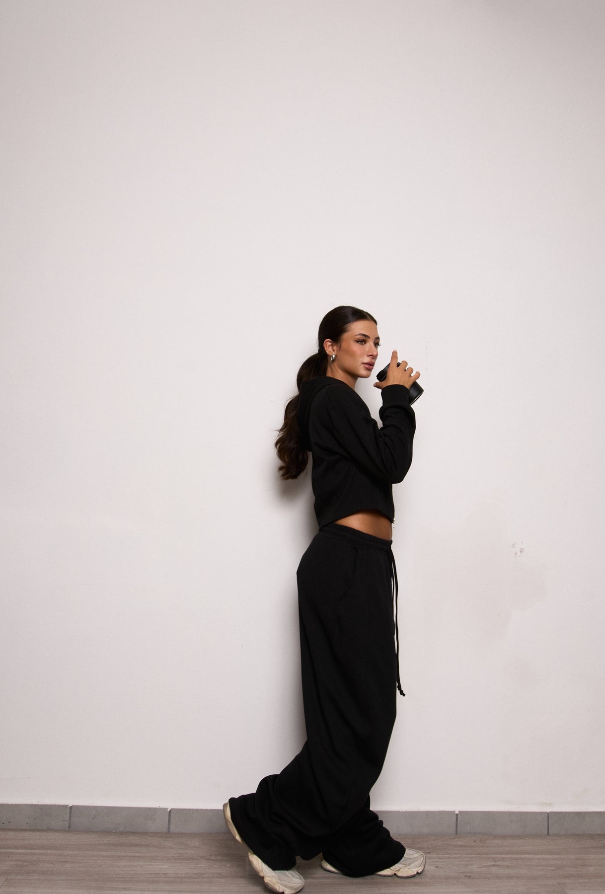 Coordinato tuta composto da pantalone ampio morbido a palloncino e felpina crop con zip e cappuccio, dettaglio spallini imbottiti  (70% cotone, 30% poliestere)