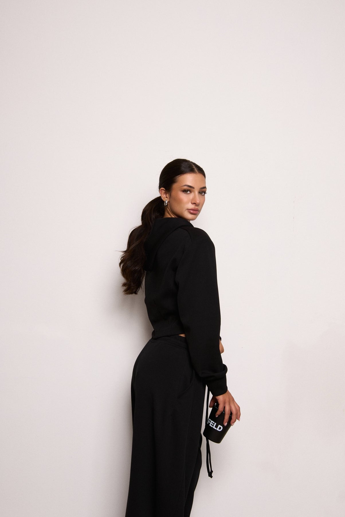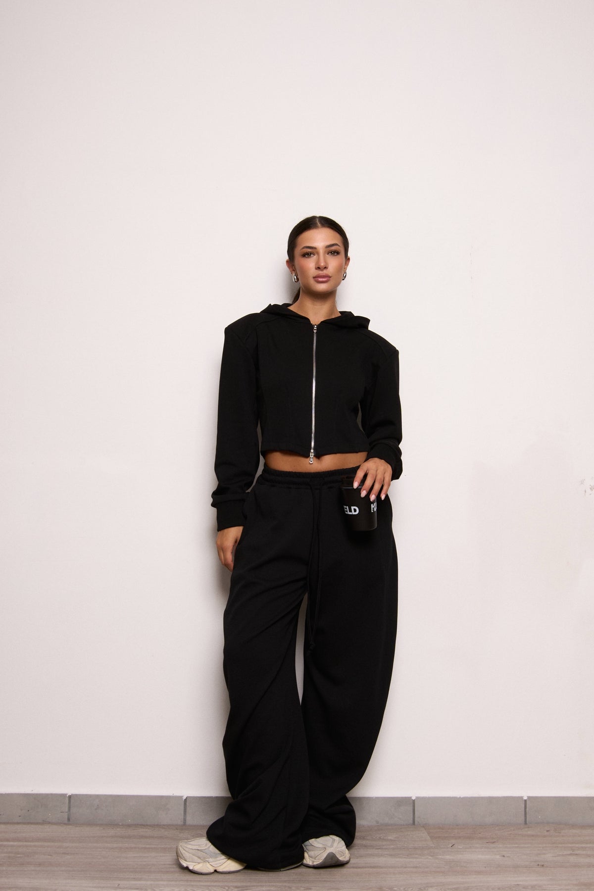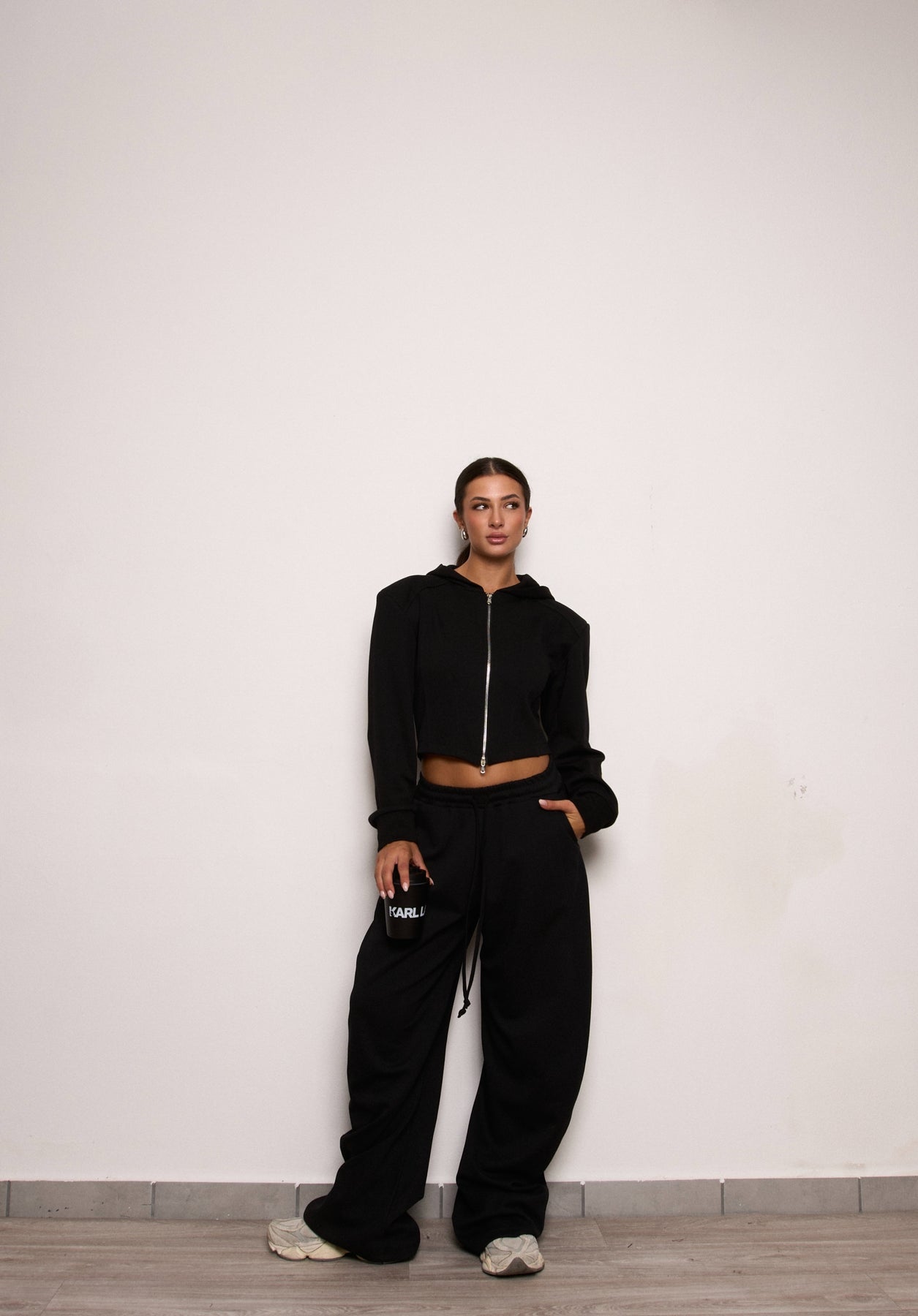 Coordinato tuta composto da pantalone ampio morbido a palloncino e felpina crop con zip e cappuccio, dettaglio spallini imbottiti  (70% cotone, 30% poliestere)