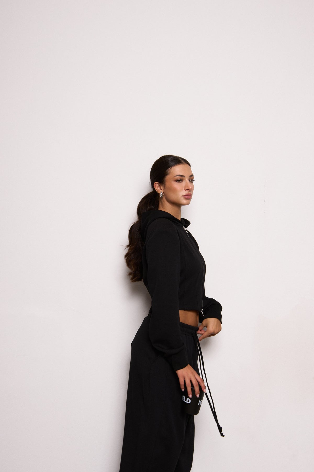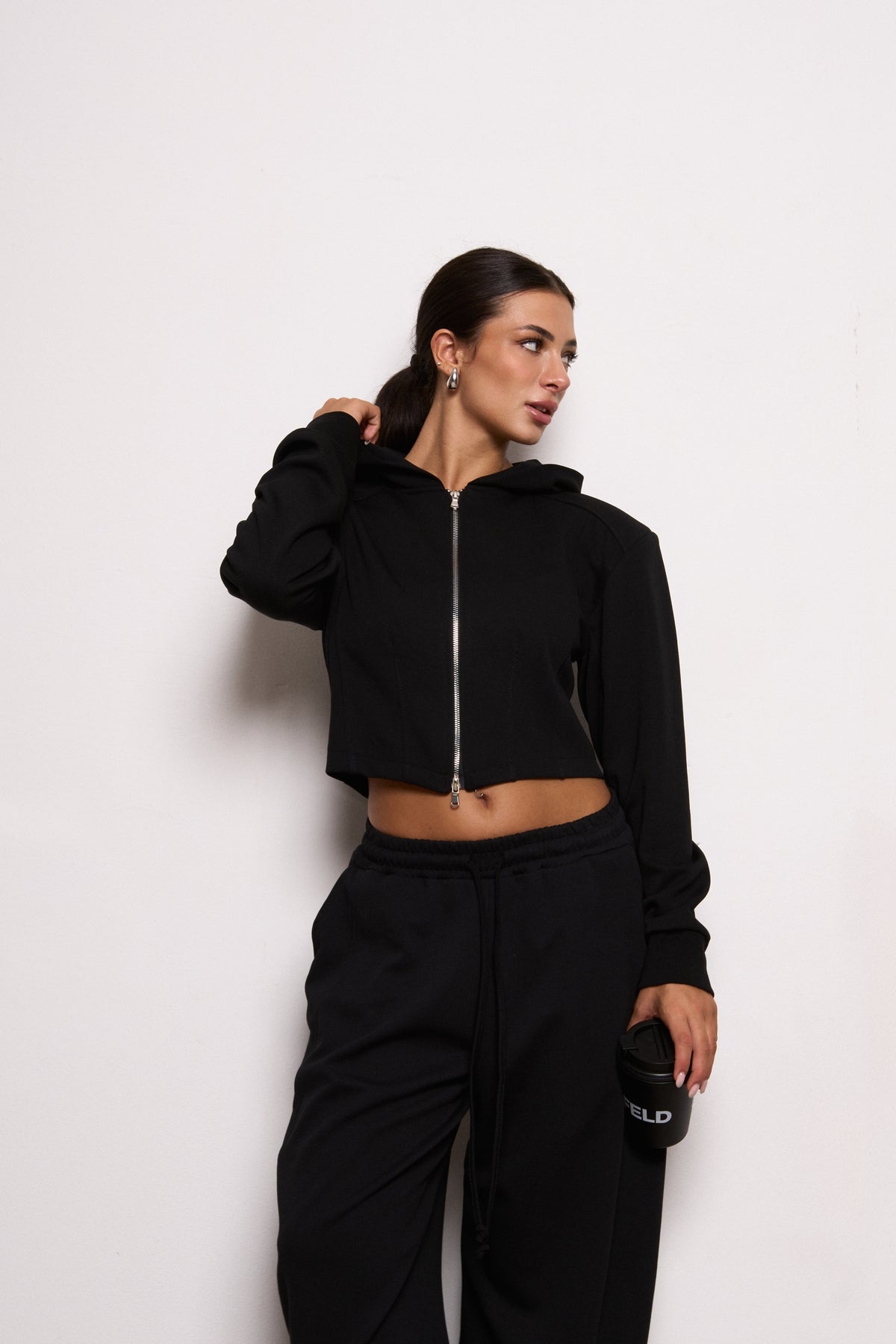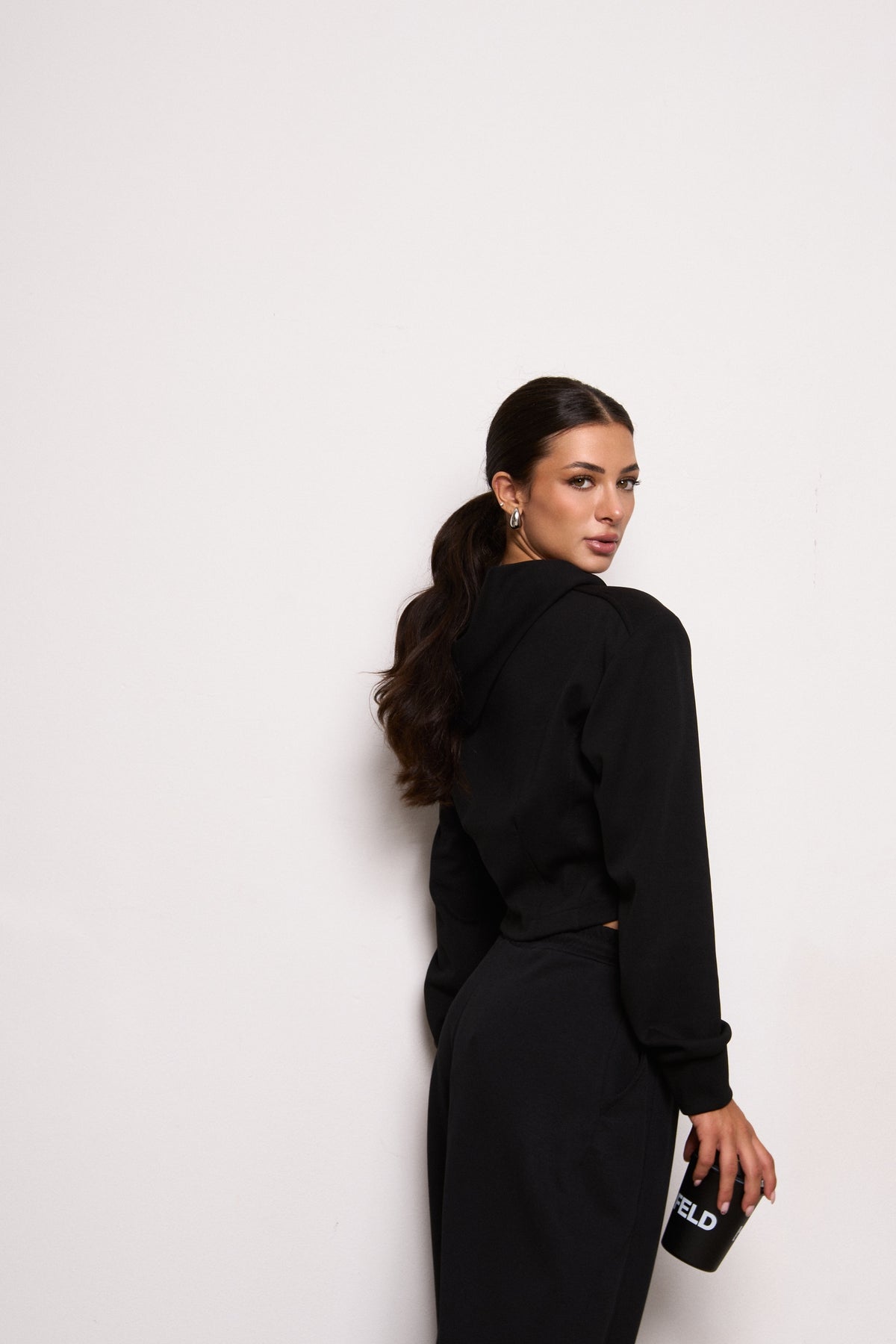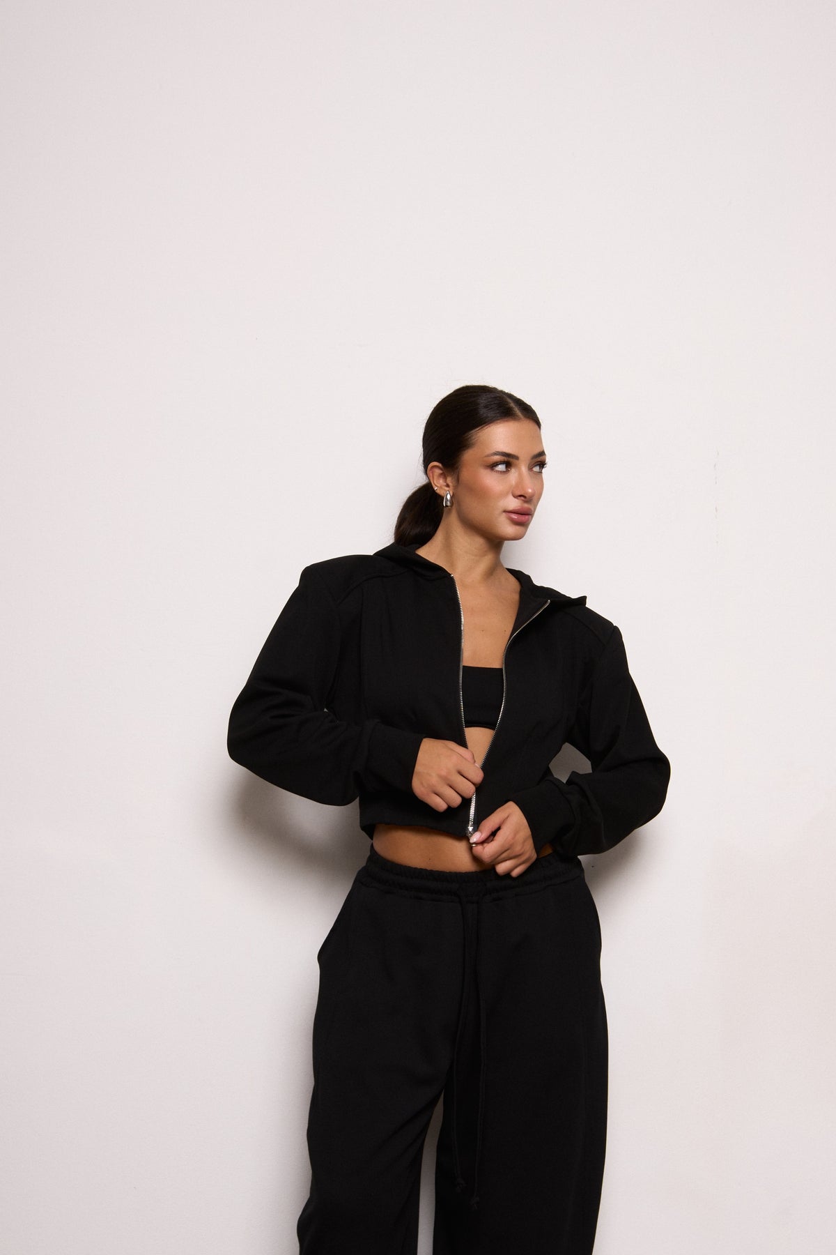 Coordinato tuta composto da pantalone ampio morbido a palloncino e felpina crop con zip e cappuccio, dettaglio spallini imbottiti  (70% cotone, 30% poliestere)