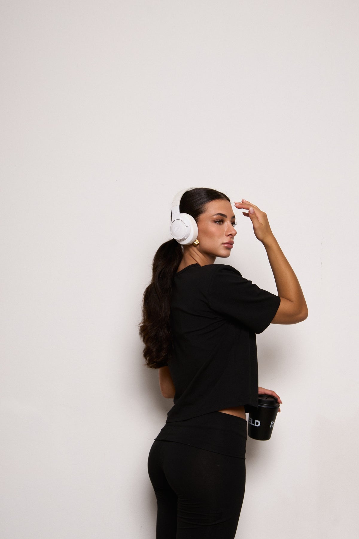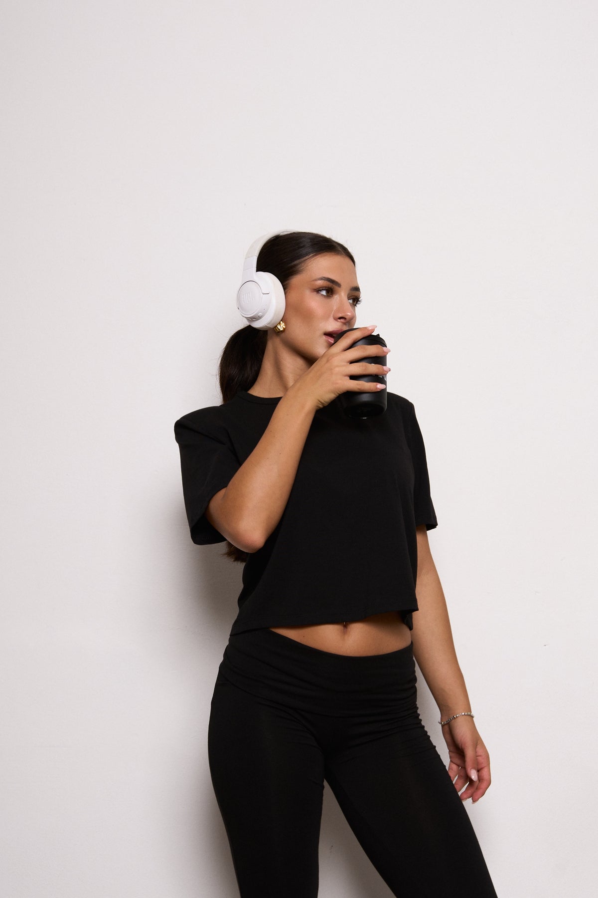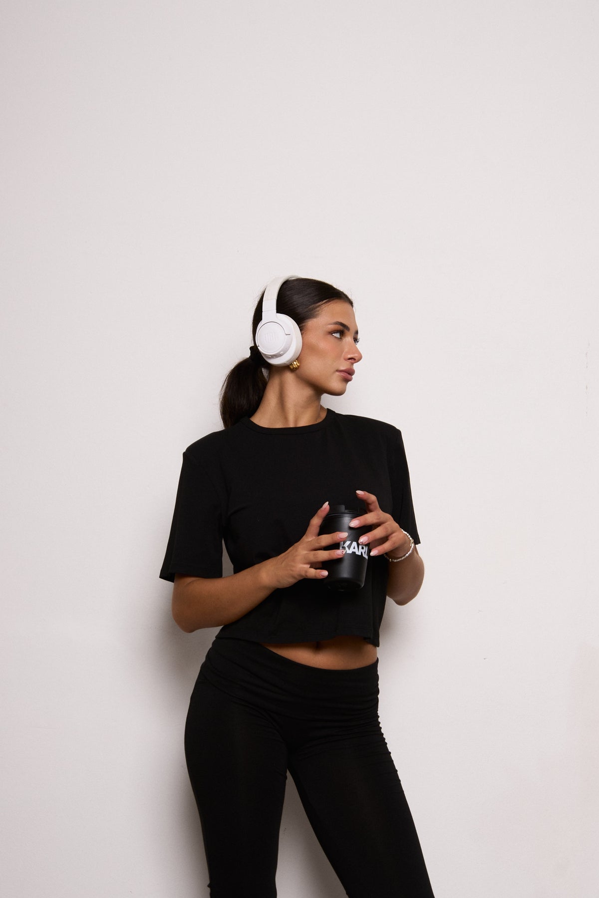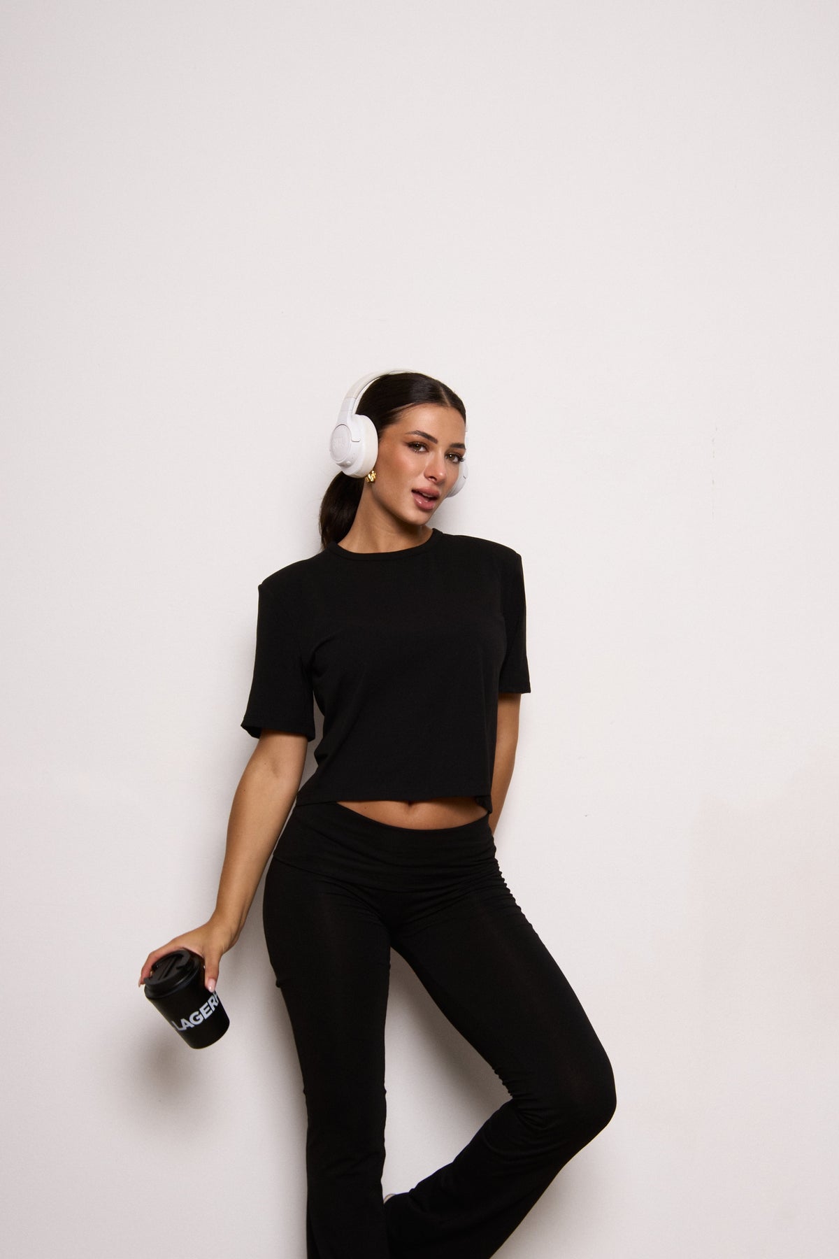 Coordinato composto da pantalone leggermente a zampa con fascione in vita e t-shirt manica corta leggermente crop con spalline imbottite (90% cotone, 10% elastan)