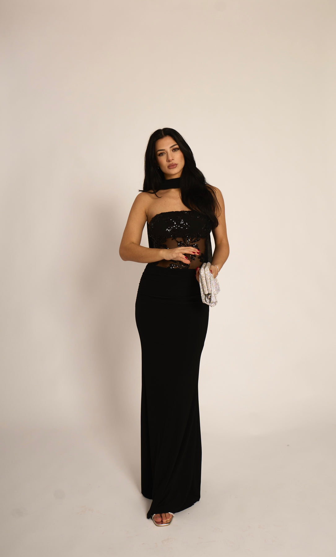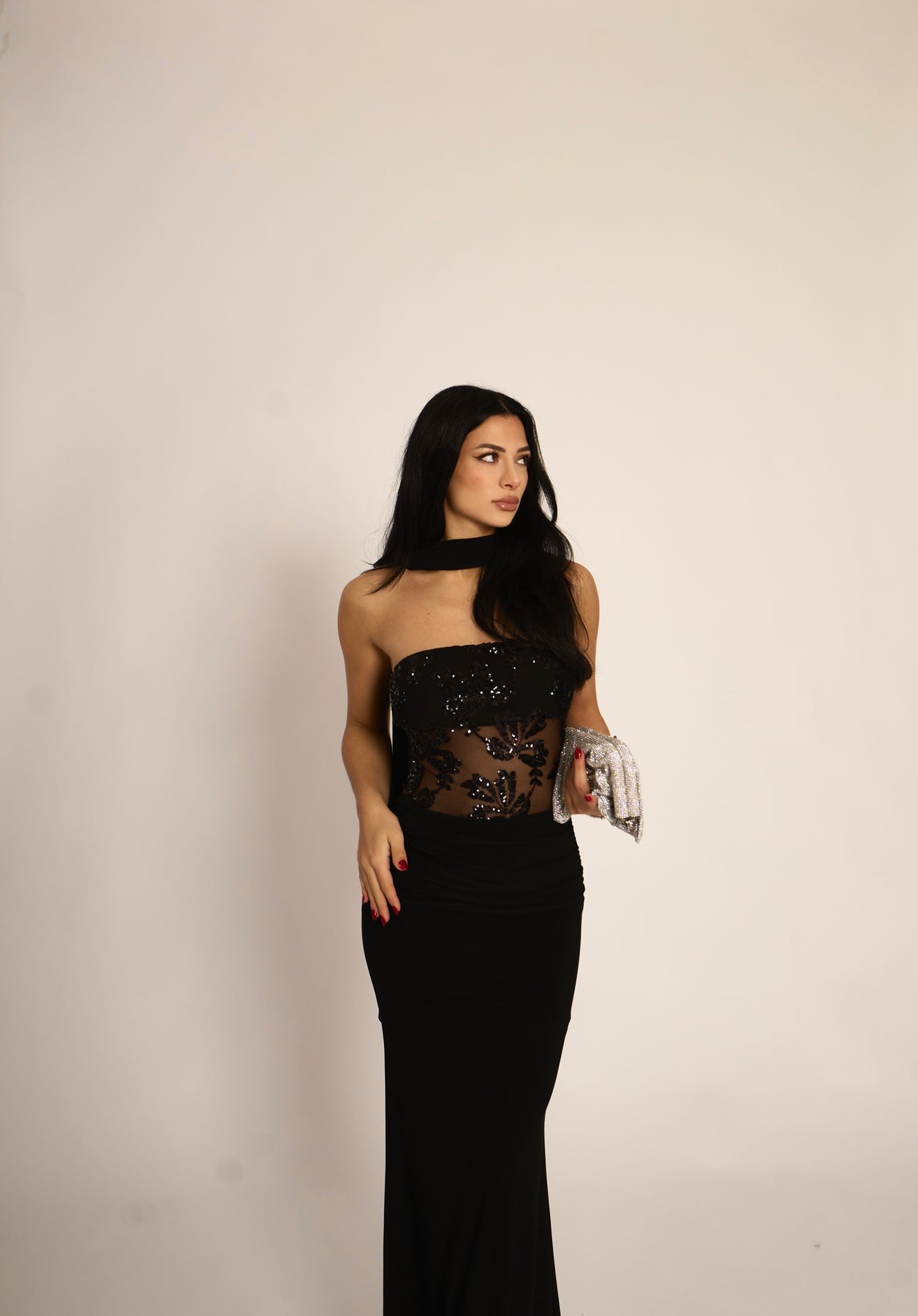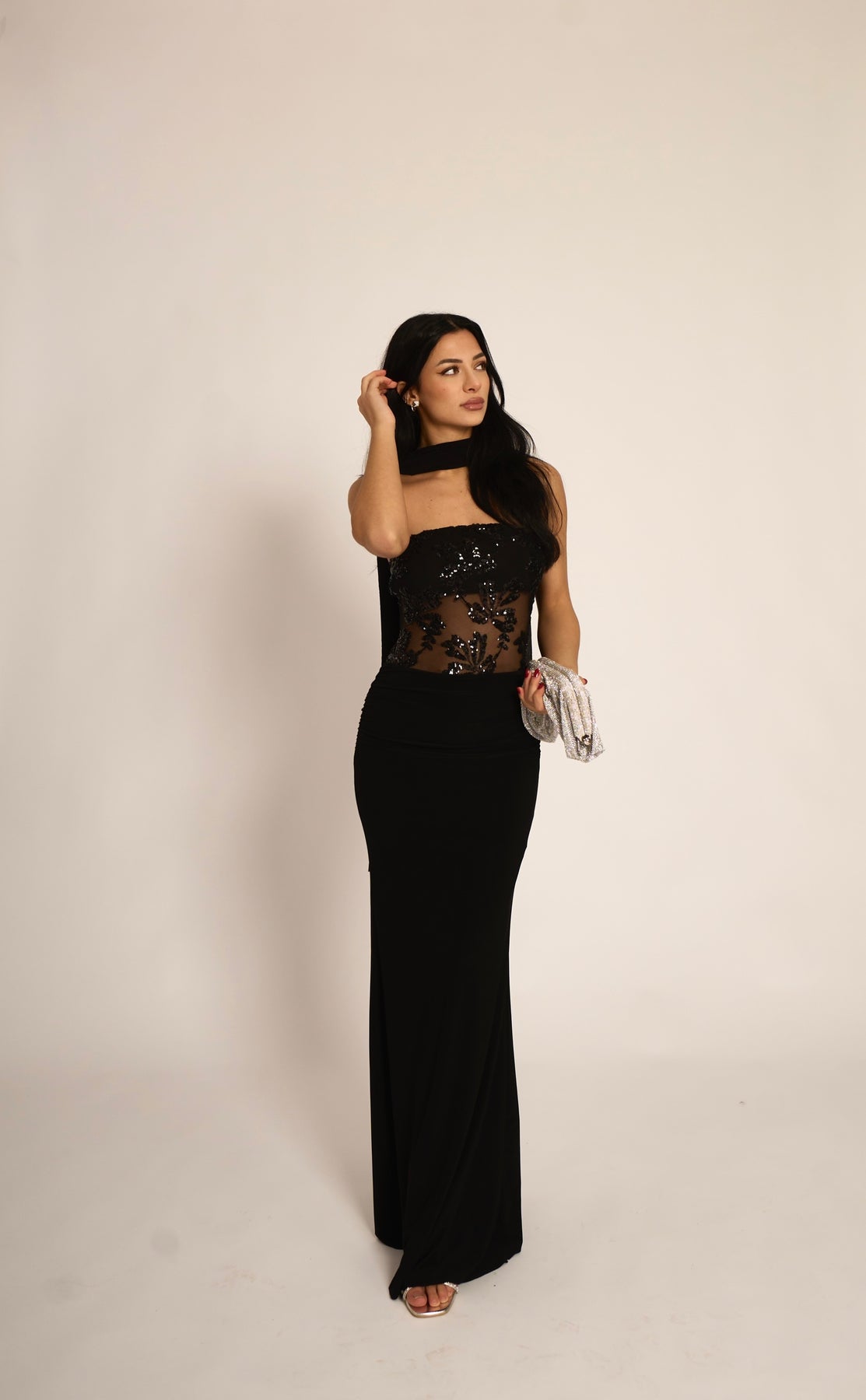 Abito lungo a fascia con dettaglio trasparenze e paillettes. La fusciacca al collo è inclusa (95% poliestere, 5% elastan)
