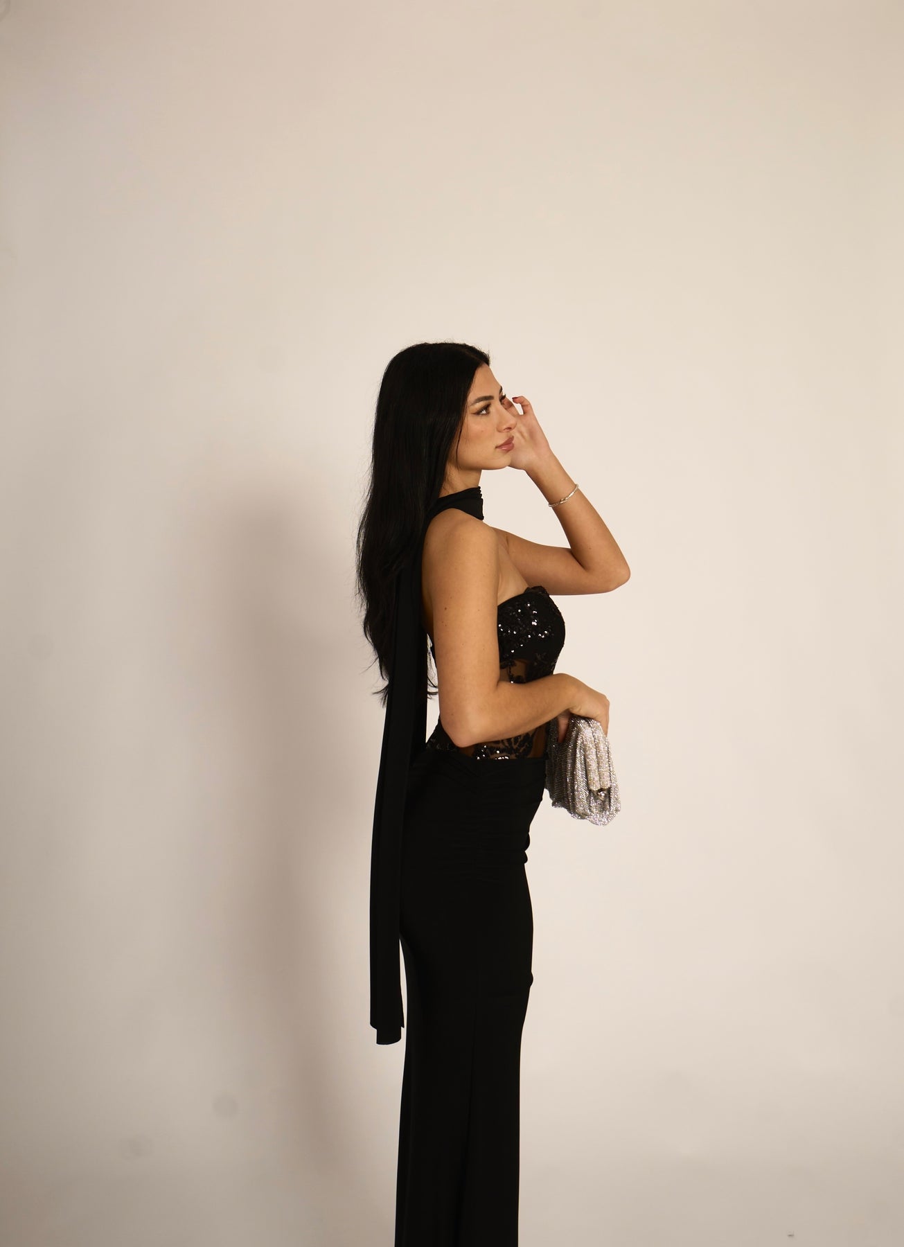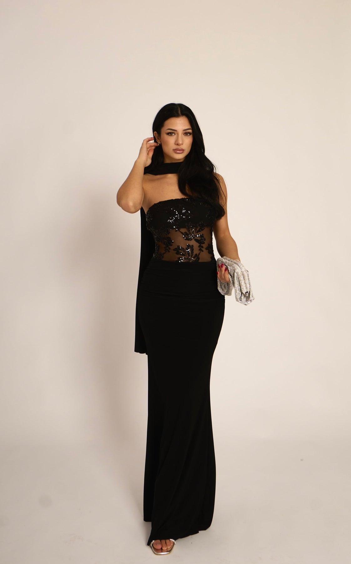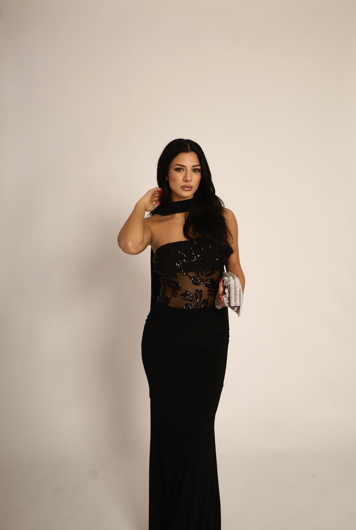 Abito lungo a fascia con dettaglio trasparenze e paillettes. La fusciacca al collo è inclusa (95% poliestere, 5% elastan)