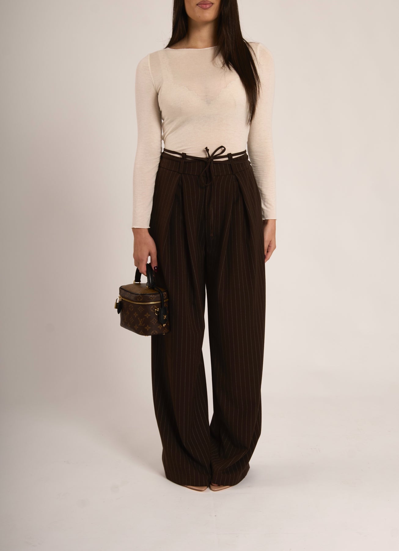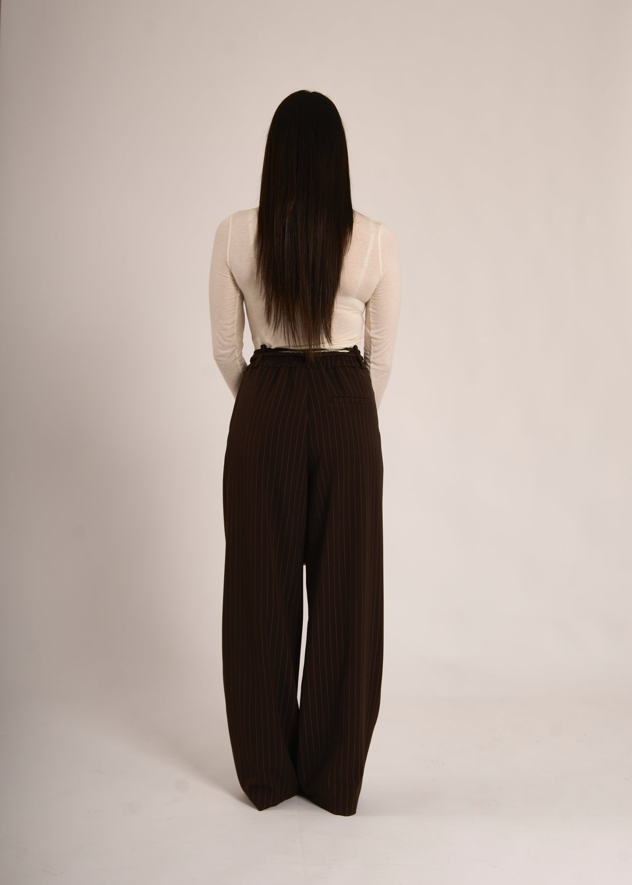 Pantalone dritto morbido gessato con dettaglio cinturino a fili (78% poliestere, 18% viscosa, 4% elastan)