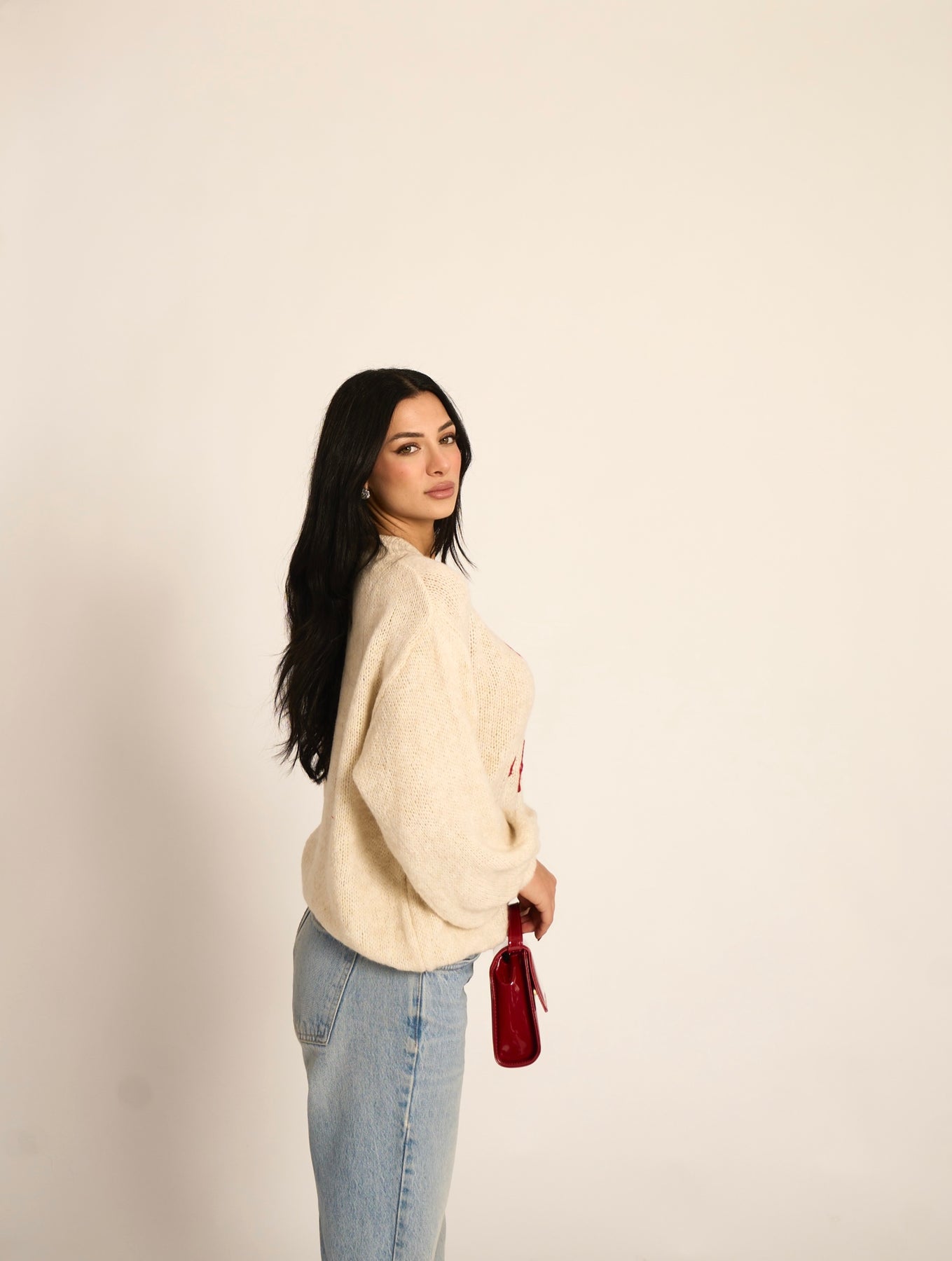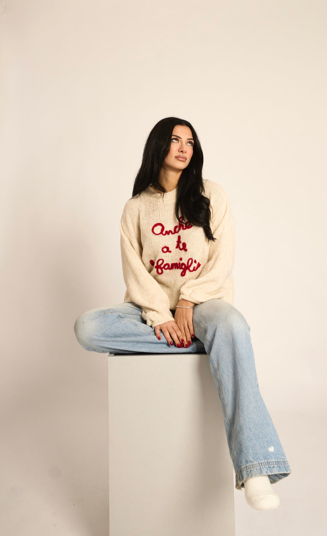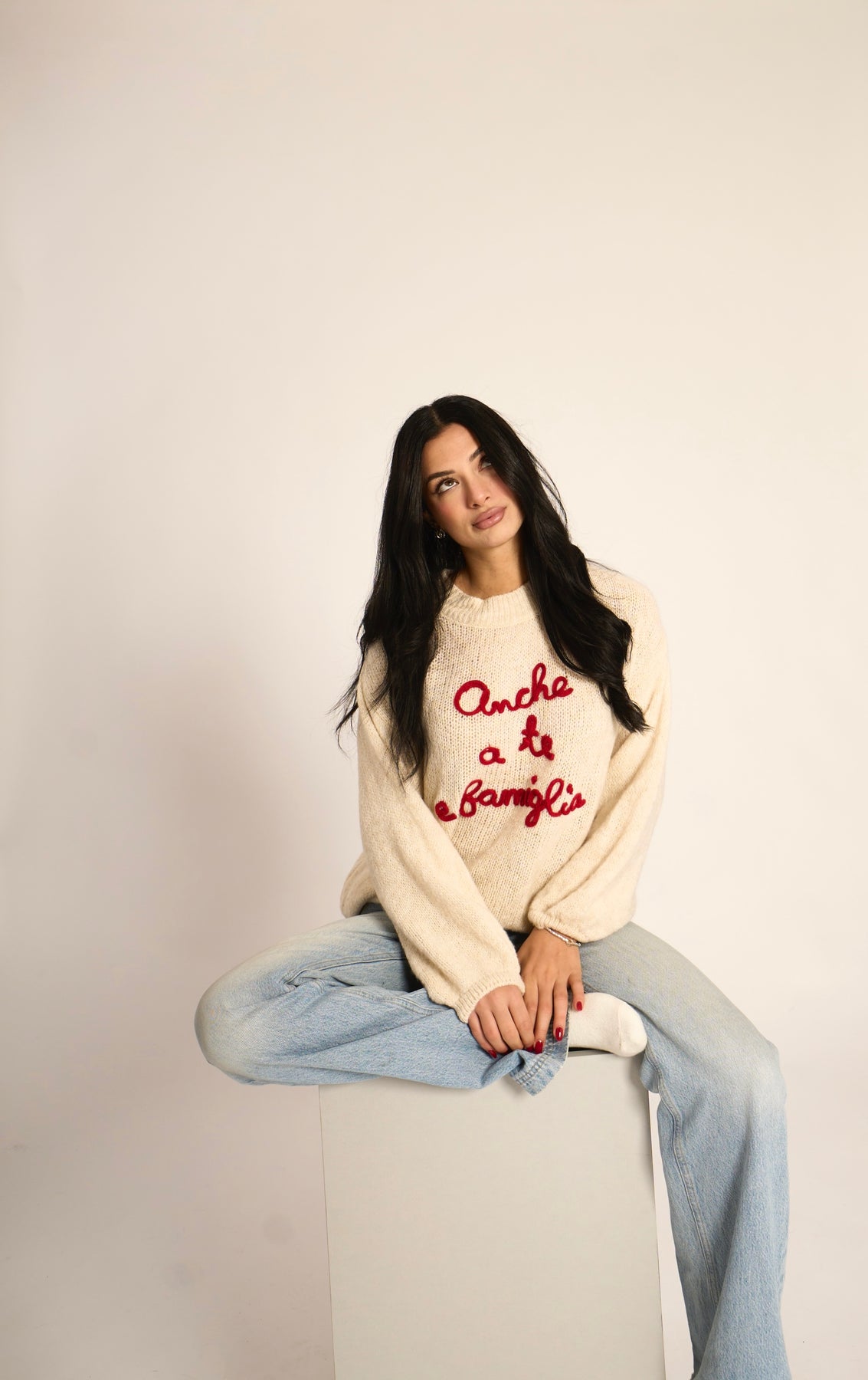 Maglione girocollo morbido con stampa ricamata "Anche a te e famiglia" (48% acrilico, 28% poliestere, 10% lana, 6% alpaca, 6% viscosa, 2% elastan)